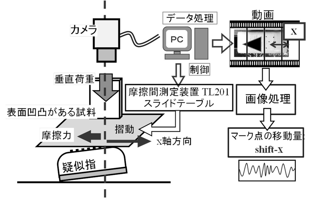 実験では、表面粗さRa=3.8μmのサンドブラスト加工を施したポリスチレン板を用い、疑似指に0.98 Nの荷重をかけてスライドさせ、摩擦時のマーク点をハイスピードカメラで撮影しました。動画データはOpenCVとPythonで処理し、マーク点の座標を抽出して波形データとして解析しました。