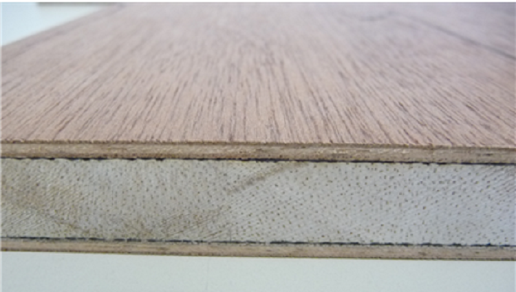融点の低いポリエチレン繊維(130℃)を用いることで成形温度を低く抑え(170℃)、木材や先染織物の劣化を防いで成形できます。溶融したポリエチレン樹脂は、表面層と中央の木材とを強固に接着して一体化した材料を容易に作製できます。また、先染織物の内部へも樹脂が十分含浸し、強固に表面へ接着します。
