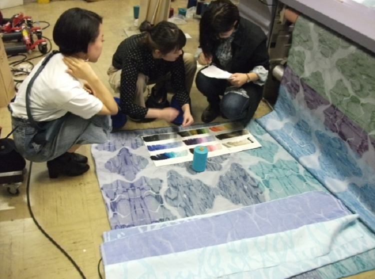 糸で染める先染織物は、一般的な後染織物(プリントなど)と比較して、鮮やかで深みのある色調などのメリットがある一方、緯(よこ)糸方向の色数制限などデザイン上の制約もあります。産地見学を通して、学生たちには「なぜそうなるのか?」を理解してもらい、先染織物ということを踏まえたデザインを考案してもらいました。